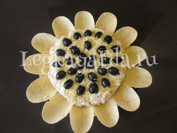 Салат «Подсолнух» с чипсами, грибами и курицей — как приготовить вкусный салат