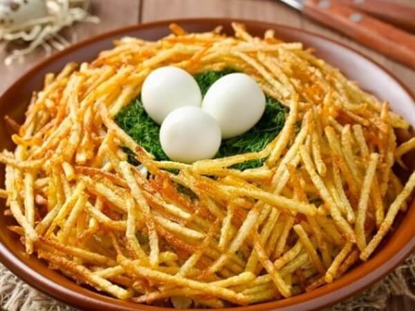 Вкусный и несложный салат, усыпанный картофелем пай, станет украшением вашего стола. Он несколько проще других вариантов готовки, поскольку в этом «гнезде» поселятся настоящие перепелиные яйца. По этому вы сэкономите время, ведь вам не нужно будет формировать яички из желтков, как в других рецептах.